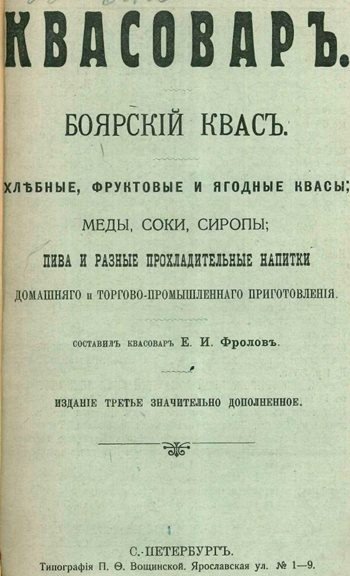 Полное название: Квасовар. Боярский квас. Хлебные, фруктовые и ягодные квасы; меды, соки, сиропы; пиво и разные прохладительные напитки домашнего и торгово-промышленного приготовления.