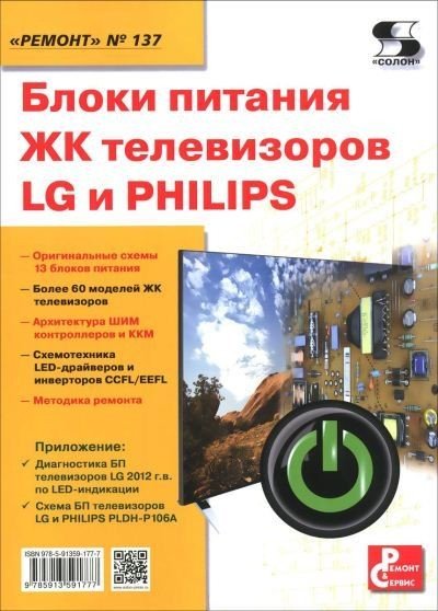 Рассматриваются блоки питания современных жидкокристаллических телевизоров LG и PHILIPS производства 2008-2012 гг. По статистике ремонтных организаций это наименее надежный узел современных телевизоров и других устройств, в которых используются ЖК панели. В книге рассматривается 12 блоков питания, которые применяются при производстве более 60 моделей телевизоров. По каждому блоку питания приводятся принципиальная электрическая схема, подробно описываются ее схемотехнические особенности, включая архитектуру интегральных контроллеров, а также перечень типовых неисправностей и способы их устранения. В приложении к книге приведена методика диагностики блоков питания телевизоров LG 2012 года выпуска (более 90 моделей) по светодиодной индикации - LED-индикатор в этих телевизорах размещен непосредственно на плате блока питания. Книга предназначена для специалистов, занимающихся ремонтом телевизионной и офисной техники, а также для учащихся профильных учебных заведений и радиолюбителей, интересующихся этой темой.